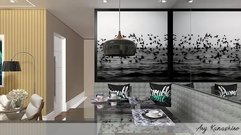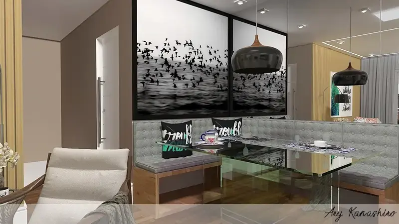 Espelhos são sempre uma boa sacada, para ambientes rentes à mesas de jantar, quando se trata de apartamentos mais compactos.