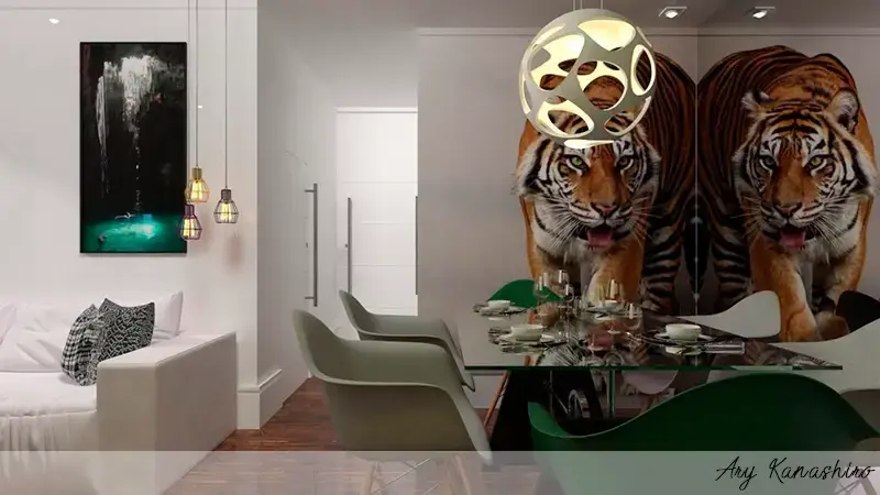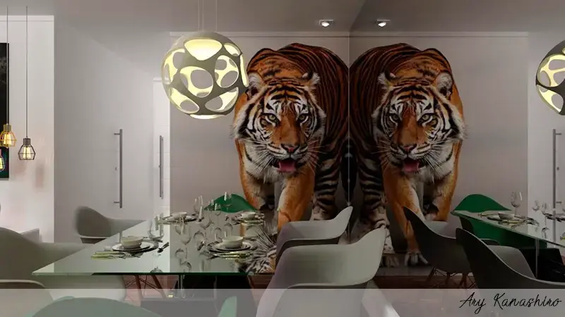 Para esta mesa com traços industriais, e acabamento contemporâneo, utilizamos um papel de parede um tanto diferenciado, brincando com a sobreposição do animal no espelho.