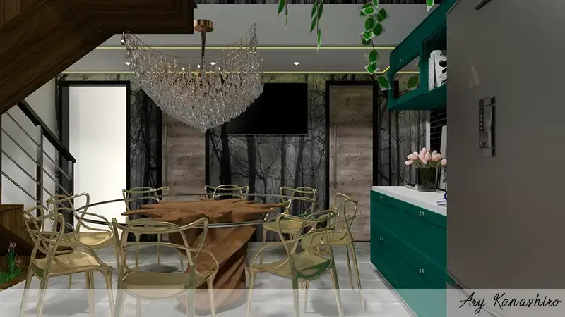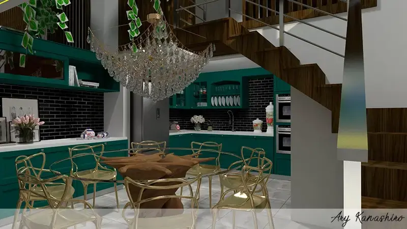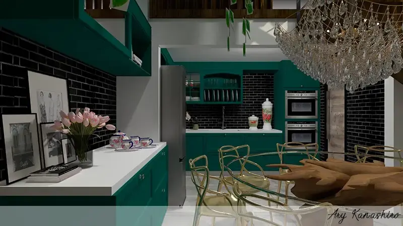 Uma cozinha clássica em tons verdes e com um lindo lustre pode ser a escolha perfeita para quem busca uma decoração elegante e sofisticada. O tom verde traz uma sensação de tranquilidade e frescor ao ambiente, enquanto o lustre adiciona um toque de glamour. Combinado com móveis em madeira clara, essa cozinha é um exemplo de como elementos clássicos podem ser incorporados a um design moderno. Além disso, o uso de tons neutros em paredes e pisos ajuda a destacar os detalhes em verde e o brilho do lustre. Uma cozinha como essa pode ser perfeita para quem adora cozinhar e receber convidados, pois oferece um ambiente agradável e acolhedor. Experimente adicionar plantas ou acessórios de cobre para complementar ainda mais essa decoração clássica e moderna.