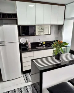 Outra estratégia importante é escolher a cor certa. Cores claras, como branco, bege ou cinza claro, podem fazer a cozinha parecer mais espaçosa e refletir a luz de forma mais eficiente. Escolha eletrodomésticos compactos e eficientes para economizar espaço e instale iluminação adequada para destacar os pontos fortes do ambiente.